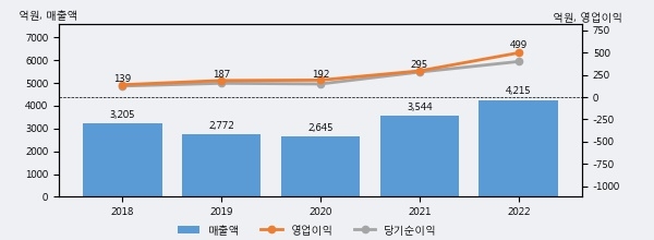 최근 실적을 살펴보면 2022년 매출액이 최근 5년 중 가장 높은 실적을 기록했음을 알 수 있다. 이전 최고 실적이었던 2021년 보다도 18.9%(670억 6천만원) 늘어난 것으로 나타났다.