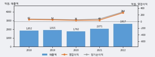 최근 실적을 살펴보면 2022년 매출액이 최근 5년 중 가장 높은 실적을 기록했음을 알 수 있다. 이전 최고 실적이었던 2021년 보다도 26.3%(545억 5천만원) 늘어난 것으로 나타났다.