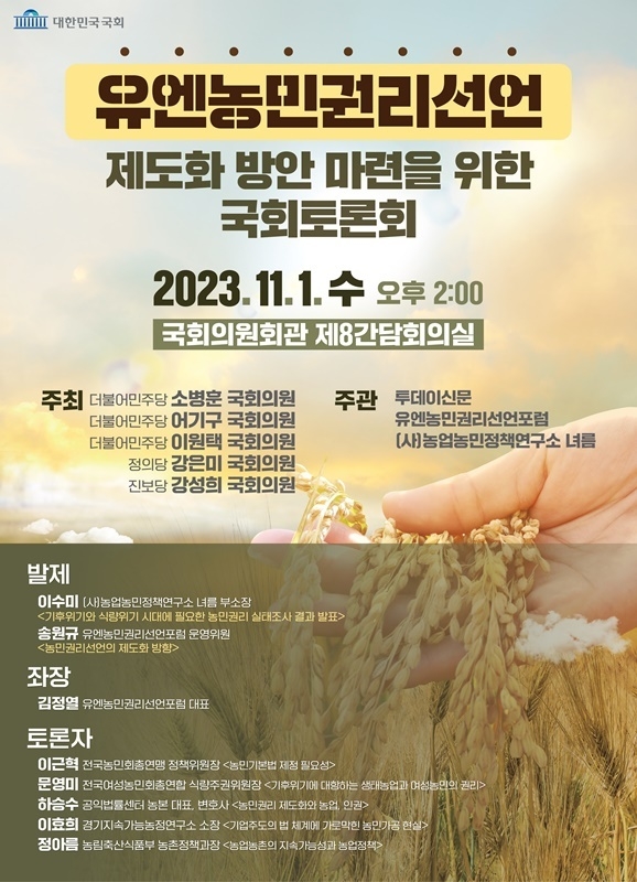 투데이신문은 ‘유엔농민권리선언 제도화 방안 마련을 위한 국회토론회’를 다음달인 11월 1일 국회 의원회관 제8간담회의실에서 진행한다고 24일 밝혔다.