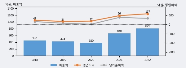 최근 실적을 살펴보면 2022년 매출액이 최근 5년 중 가장 높은 실적을 기록했음을 알 수 있다. 이전 최고 실적이었던 2021년 보다도 21.8%(143억 9천만원) 늘어난 것으로 나타났다.