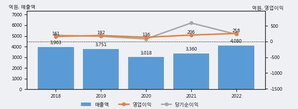 최근 실적을 살펴보면 2022년 매출액이 최근 5년 중 가장 높은 실적을 기록했음을 알 수 있다. 이전 최고 실적이었던 2018년 보다도 3.0%(117억 6천만원) 늘어난 것으로 나타났다.