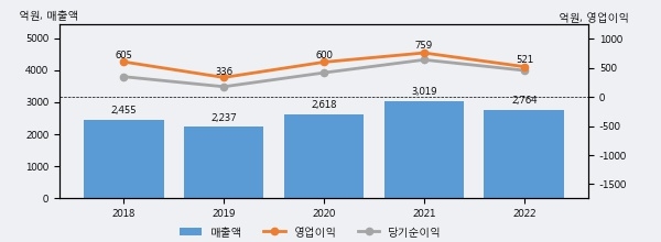 PI첨단소재의 2022년 매출액은 전년대비 -8.4% 줄어든 2764억원이고, 영업이익 역시 전년대비 -31.3% 줄어든 521억원을 기록했다. 이 회사의 매출액 증감률과 영업이익 증감률은 각각 코스피 하위 7%, 하위 27%에 해당된다.