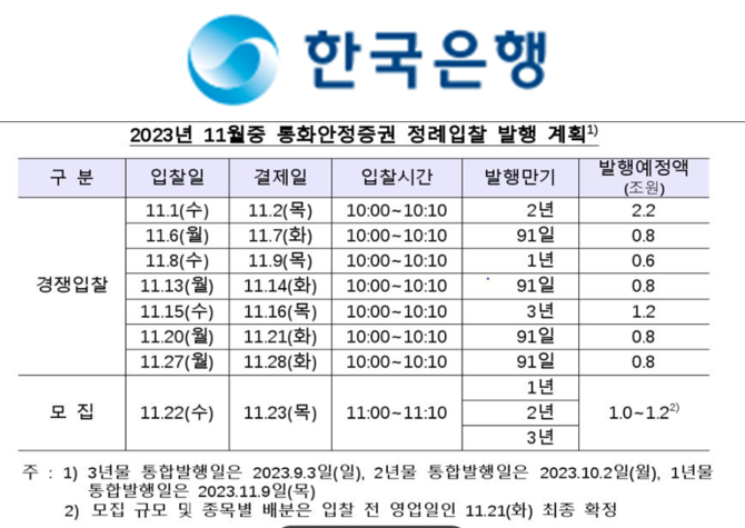 이달 발행 계획 물량과 비교하면 발행 규모가 1조5천억원 줄었다. 8조4천억원 가운데 7조2천억원은 경쟁입찰 방식으로, 1조∼1조2천억원은 모집 방식으로 발행될 예정이다.