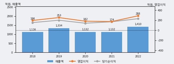 최근 실적을 살펴보면 2022년 매출액이 최근 5년 중 가장 높은 실적을 기록했음을 알 수 있다. 이전 최고 실적이었던 2019년 보다도 5.7%(75억 4천만원) 늘어난 것으로 나타났다.