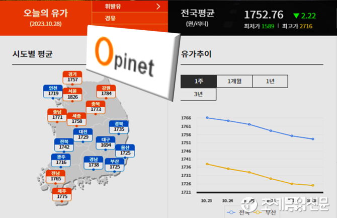 28일 한국석유공사 유가정보시스템 오피넷에 따르면 이달 넷째주(22∼26일) 전국 주유소 휘발유 판매가격은 지난주 대비 11.5원 내린 L당 1천763.5원을 기록했다.