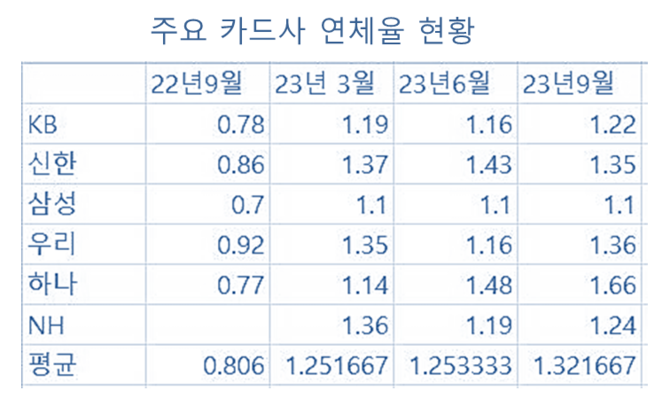 29일 금융업계에 따르면 현재까지 실적이 발표된 금융지주 계열 카드사(신한·KB·하나·우리·NH)와 삼성카드의 3분기 말 기준 연체율 평균은 1.32%로, 2분기 말(1.25%) 대비 0.07%포인트(p), 지난해 3분기 말(0.81%) 대비 0.51%p 올라간 것으로 집계됐다.