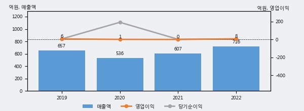 최근 실적을 살펴보면 2022년 매출액이 최근 4년 중 가장 높은 실적을 기록했음을 알 수 있다. 이전 최고 실적이었던 2019년 보다도 9.0%(59억 2천만원) 늘어난 것으로 나타났다.