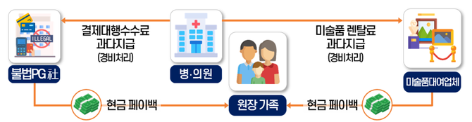 코로나 호황 병·의원들은 병의원 경비를 부풀려 불법 결제대행업체로 지출하고, 다시 그 불법대행업체로부터 수수료를 뗀 나머지를 페이백 받는 방식으로 돈을 빼돌렸다.