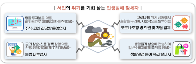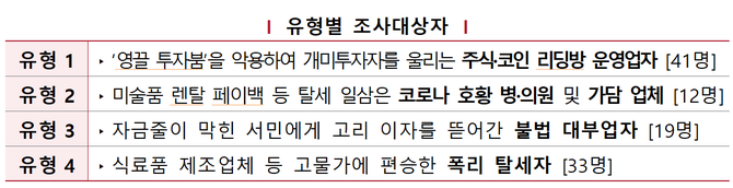 이번에 신규로 착수하는 민생침해 탈세자는 ▲주식·코인 리딩방 운영업자 41명 ▲코로나 호황 병·의원 및 가담 업체 12명 ▲불법 대부업자 19명 ▲생활밀접 분야 폭리 탈세자 33명 등 총 105명이다.