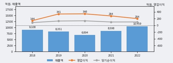 최근 실적을 살펴보면 2022년 매출액이 최근 5년 중 가장 높은 실적을 기록했음을 알 수 있다. 이전 최고 실적이었던 2018년 보다도 14.8%(1350억 7천만원) 늘어난 것으로 나타났다.