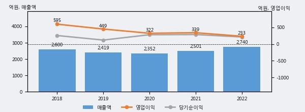 최근 실적을 살펴보면 2022년 매출액이 최근 5년 중 가장 높은 실적을 기록했음을 알 수 있다. 이전 최고 실적이었던 2018년 보다도 5.4%(140억 1천만원) 늘어난 것으로 나타났다.