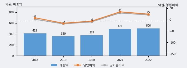 성문전자의 2022년 매출액은 전년대비 1.3% 늘어난 500억원이고, 영업이익은 전년대비 -28.2% 줄어든 25억원을 기록했다. 이 회사의 매출액 증감률과 영업이익 증감률은 각각 코스피 하위 18%, 하위 29%에 해당된다.