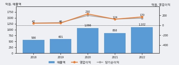 최근 실적을 살펴보면 2022년 매출액이 최근 5년 중 가장 높은 실적을 기록했음을 알 수 있다. 이전 최고 실적이었던 2020년 보다도 3.3%(35억 7천만원) 늘어난 것으로 나타났다.