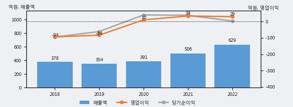 픽셀플러스의 2022년 매출액은 전년대비 24.2% 늘어난 629억원이고, 영업이익은 전년대비 -13.1% 줄어든 29억원을 기록했다. 이 회사의 매출액 증감률과 영업이익 증감률은 각각 코스닥 상위 31%, 하위 40%에 해당된다.