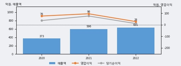 최근 실적을 살펴보면 2022년 매출액이 최근 3년 중 가장 높은 실적을 기록했음을 알 수 있다. 이전 최고 실적이었던 2021년 보다도 5.8%(34억 7천만원) 늘어난 것으로 나타났다.