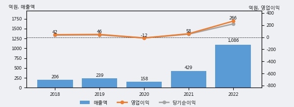 최근 실적을 살펴보면 2022년 매출액이 최근 5년 중 가장 높은 실적을 기록했음을 알 수 있다. 이전 최고 실적이었던 2021년 보다도 152.9%(656억 4천만원) 늘어난 것으로 나타났다.