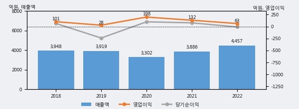 최근 실적을 살펴보면 2022년 매출액이 최근 5년 중 가장 높은 실적을 기록했음을 알 수 있다. 이전 최고 실적이었던 2018년 보다도 12.9%(509억 4천만원) 늘어난 것으로 나타났다.