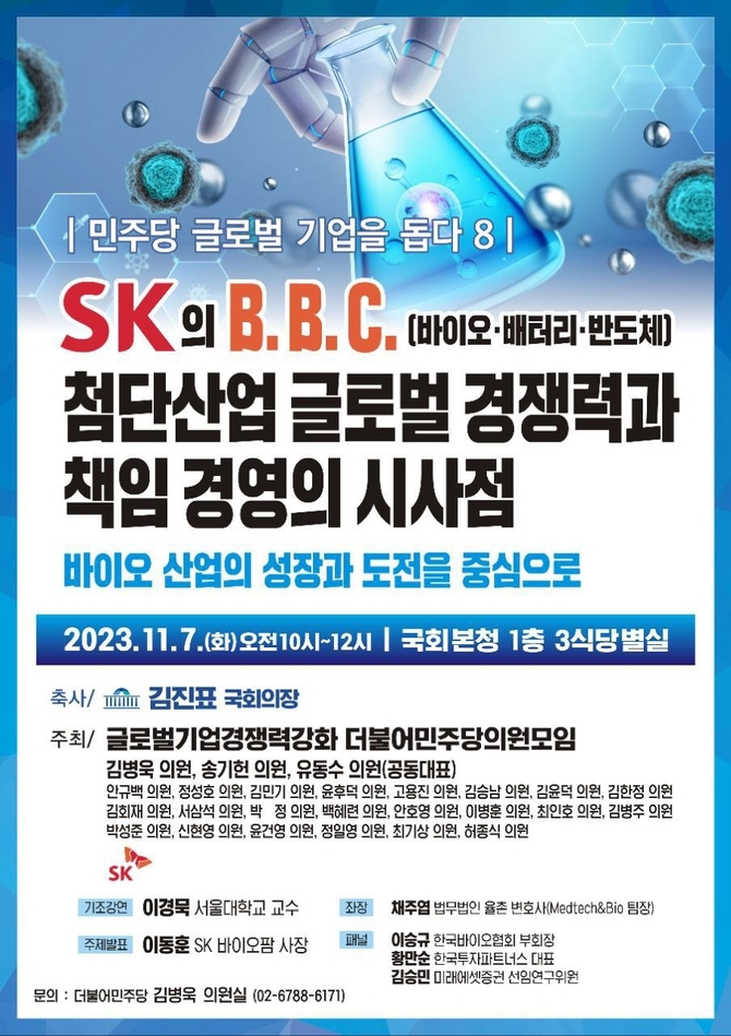 더불어민주당 소속 의원들로 구성된 '글로벌 기업 경쟁력 강화 의원 모임'은 7일 오전 서울 여의도 국회에서 열린 'SK의 BBC(바이오·배터리·반도체 첨단산업) 글로벌 경쟁력과 책임경영의 시사점' 토론회에서 이같은 의견이 나왔다.
