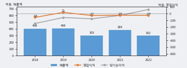 와이제이엠게임즈의 2022년 매출액은 전년대비 -21.3% 줄어든 302억원이고, 영업이익은 전년에 이어 적자가 지속되어 -24억원을 기록했다. 이 회사의 매출액 증감률과 영업이익 증감률은 각각 코스닥 하위 9%, 하위 45%에 해당된다.
