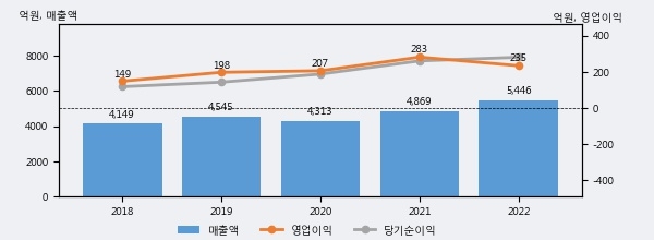 최근 실적을 살펴보면 2022년 매출액이 최근 5년 중 가장 높은 실적을 기록했음을 알 수 있다. 이전 최고 실적이었던 2021년 보다도 11.8%(576억 8천만원) 늘어난 것으로 나타났다.