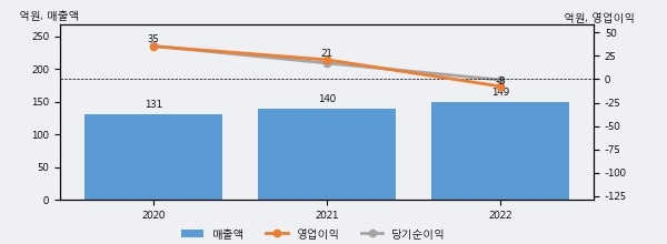 최근 실적을 살펴보면 2022년 매출액이 최근 3년 중 가장 높은 실적을 기록했음을 알 수 있다. 이전 최고 실적이었던 2021년 보다도 6.4%(9억원) 늘어난 것으로 나타났다.