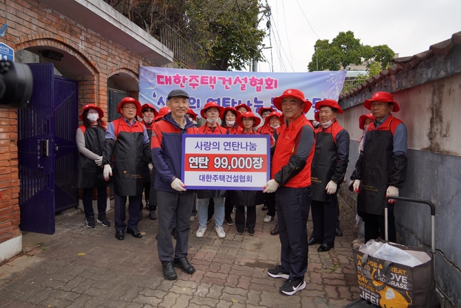 (조세금융신문=구재회 기자) 대한주택건설협회는 9일 서울 동작구 등 전국 13개 지역에서 연탄 9만9천여장(8천383만원 상당)을 전달하는 '사랑의 연탄나눔' 봉사활동을 전개했다고 밝혔다.