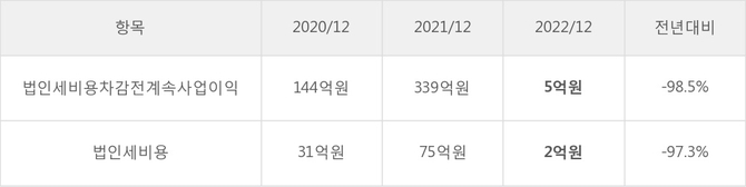 연우의 지난 3년 동안 법인세 납부액 추이를 보면 2021년에는 증가했으나, 작년에는 2억원으로 크게 감소했다.