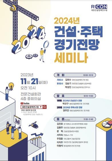 (조세금융신문=구재회 기자) 대한건설정책연구원은 오는 21일 '2024년 건설·주택 경기전망 세미나'를 개최한다고 14일 밝혔다.