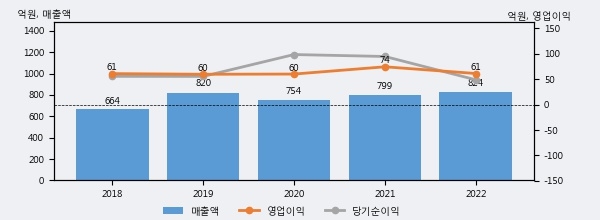 최근 실적을 살펴보면 2022년 매출액이 최근 5년 중 가장 높은 실적을 기록했음을 알 수 있다. 이전 최고 실적이었던 2019년 보다도 0.4%(3억 2천만원) 늘어난 것으로 나타났다.