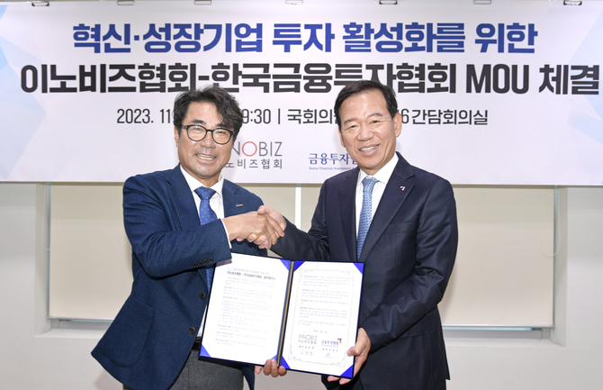 (조세금융신문=송기현 기자) 금융투자협회는 이노비즈협회와 15일 여의도 국회 의원회관에서 중소·혁신성장기업의 투자 활성화를 위한 업무협약(MOU)을 체결했다고 밝혔다.