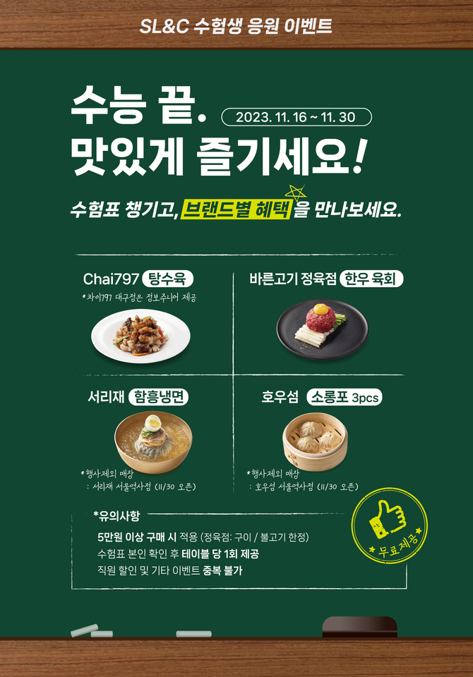 이번 이벤트는 오늘(16일)부터 30일까지 2주간 각 브랜드별로 진행된다. 가족들과 함께 즐기기 좋은 모던 중식당 Chai797에서는 탕수육, 바른고기 정육점에서는 한우 육회를 제공하며, 먹고 보는 재미를 모두 갖춰 MZ세대의 큰 사랑을 받고 있는 홍콩식 대중음식점 호우섬은 딤섬, 직화구이 전문점 서리재는 냉면을 제공한다. 해당 메뉴는 특정 금액 이상 주문하고, 본인 수험표를 현장에서 인증하면 테이블당 1회 제공된다.