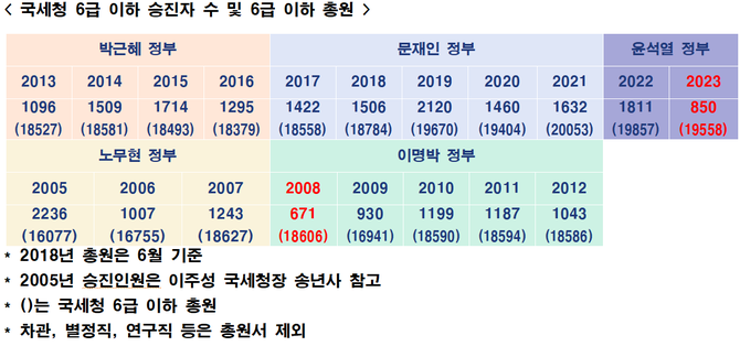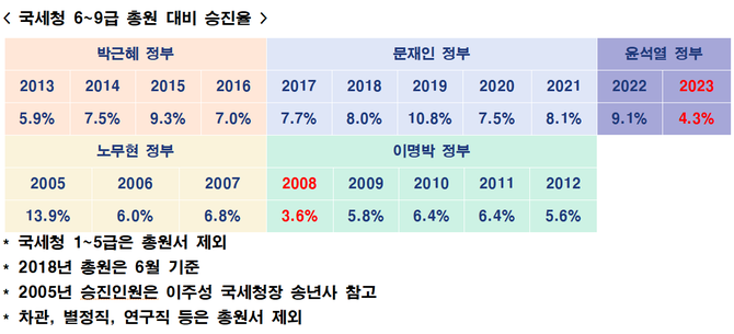 노무현 정부(2003~2007년)는 정부 내내 국세청 총원 3196명을 늘렸다. 2006~2007년 승진율은 6% 대지만, 2005년에 승진율을 13.9%나 당겨줬다.