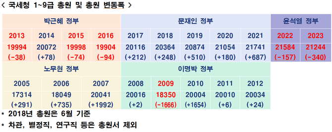 결국 2009년 1만8350명까지 내려갔던 국세청 총원은 이명박 정부 말인 2012년 2만34명까지 올라갔다.