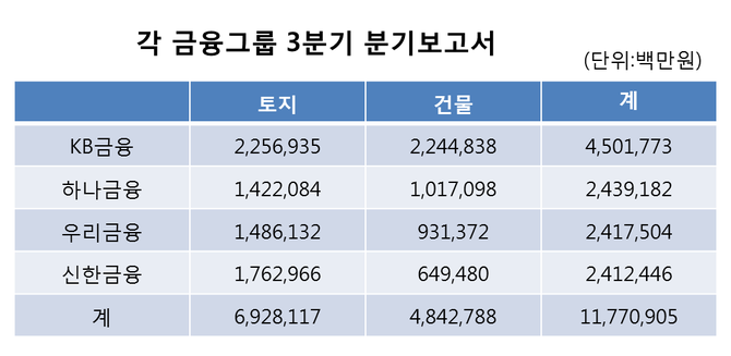 나머지 3개 금융그룹은 비슷했다. 하나금융은 토지 1조4천221억원, 건물 1조171억원 등 2조4천392억원을, 우리금융은 토지 1조4천861억원, 건물 9천314억원 등 2조4천175억원을 각각 보유했다. 또 신한금융은 토지 1조4천861억원과 건물 9천314억원 등 2조4천175억원을 가졌다.