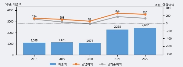 최근 실적을 살펴보면 2022년 매출액이 최근 5년 중 가장 높은 실적을 기록했음을 알 수 있다. 이전 최고 실적이었던 2021년 보다도 5.9%(134억 7천만원) 늘어난 것으로 나타났다.
