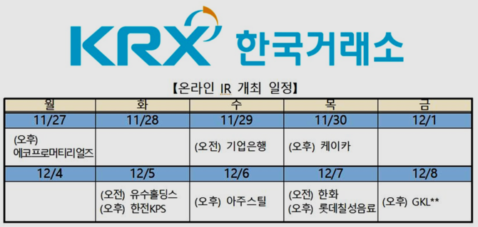 (조세금융신문=김종태 기자) 한국거래소가 유가증권시장 상장기업 9개 사가 참여하는 '2023년 제3차 유가증권시장 온라인 IR'을 시행한다.