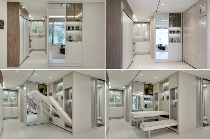 지난해 처음으로 선보인 무빙 수납장에 벽체 매립형 가구를 추가해 주방에서 거실로 연결되는 공간의 활용성을 높인 설계 상품이다. 버튼 하나로 대형 수납장을 이동시키고, 리모컨을 조작해 벽에 매립돼 있던 다이닝 테이블과 의자를 한 번에 배치해 하나의 공간을 다양한 형태로 사용할 수 있다.