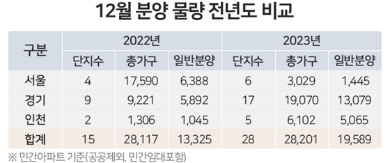 30일 부동산시장 분석업체 부동산인포에 따르면, 12월 중 수도권에선 총 28개 단지, 2만8202가구가 분양에 나설 것으로 집계됐다. 이중 청약통장 가입자에 일반분양 되는 물량은 1만9590가구다.