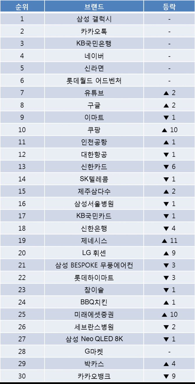 상위권에서는 삼성 갤럭시에 이어 카카오톡(2위), KB국민은행(3위), 네이버(4위), 신라면(5위), 롯데월드 어드벤처(6위) 등이 작년과 동일한 순위를 기록했다.
