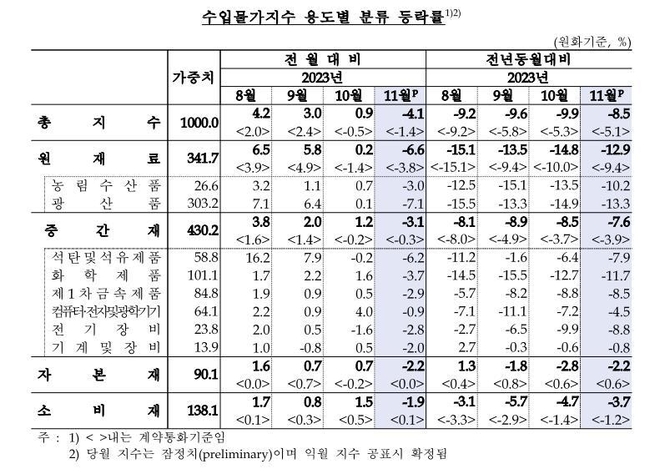 국제 유가는 10월 평균 89.75달러(두바이유·배럴당)에서 11월 83.55달러로 6.9% 하락했으며, 환율효과를 제한한 계약통화 기준 수입 물가는 전월보다 1.4% 내렸다.