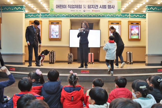 관세청은 13일 대전 복지시설에 있는 어린이 42명을 초청해 마약 탐지견의 마약 탐지 시범을 선보이고 어린이에게 직업체험의 기회를 제공하는 행사를 열었다고 밝혔다.
