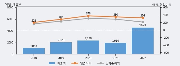 최근 실적을 살펴보면 2022년 매출액이 최근 5년 중 가장 높은 실적을 기록했음을 알 수 있다. 이전 최고 실적이었던 2020년 보다도 95.1%(2206억 6천만원) 늘어난 것으로 나타났다.