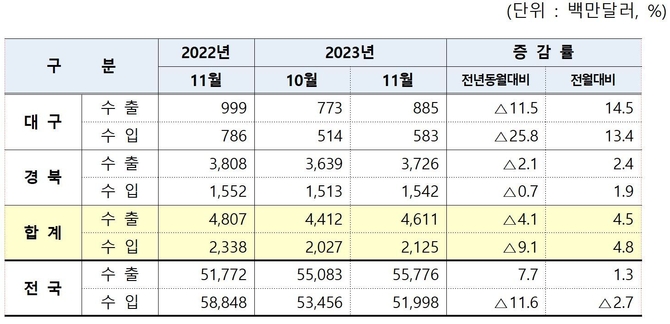 경북지역의 11월 수출은 2.1% 감소한 37억 3000만달러를 기록했으며 수입은 0.7% 감소한 15억 4000만달러로, 무역수지는 3.2% 감소한 21억 9000만 달러 흑자를 기록했다.