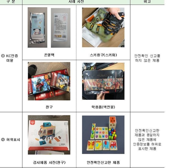 안전기준 위반 유형별로는 ▲KC안전인증 미획득(약 13만 개) ▲안전 표시사항 허위기재(약 16만 개) ▲안전 표시기준 불충족(약 18만 개) ▲안전기준 부적합(약 400개)이 적발됐다.