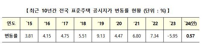 내년 표준 단독주택 공시가격은 전국 평균으로 0.57% 올랐다. 2021년 6.80%, 2022년에는 7.34% 오른 표준주택 공시가격은 올해 14년 만에 처음으로 하락(-5.95%)했다가 다시 소폭 상승으로 돌아섰다.