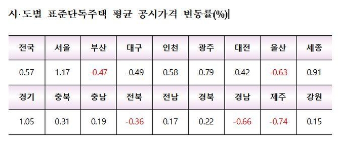 표준 단독주택 공시가격이 가장 크게 오른 곳은 서울(1.17%)이며, 경기(1.05%), 세종(0.91%), 광주(0.79%), 인천(0.58%)이 뒤를 이었다.