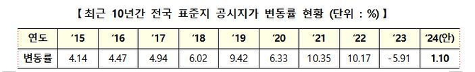 내년 표준지 공시지가는 전국 평균으로 1.1% 상승했다. 내년 표준지 공시지가 변동 폭 역시 표준주택처럼 2005년 주택 공시 제도가 도입된 이후 가장 낮았다. 시도별로는 세종(1.59%), 경기(1.24%), 대전(1.24%), 서울(1.21%), 광주(1.16%) 순으로 내년 공시지가 상승 폭이 컸다.