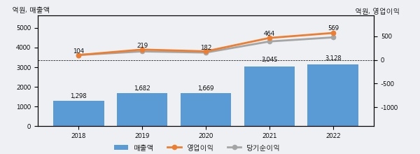 최근 실적을 살펴보면 2022년 매출액이 최근 5년 중 가장 높은 실적을 기록했음을 알 수 있다. 이전 최고 실적이었던 2021년 보다도 2.7%(83억 6천만원) 늘어난 것으로 나타났다.