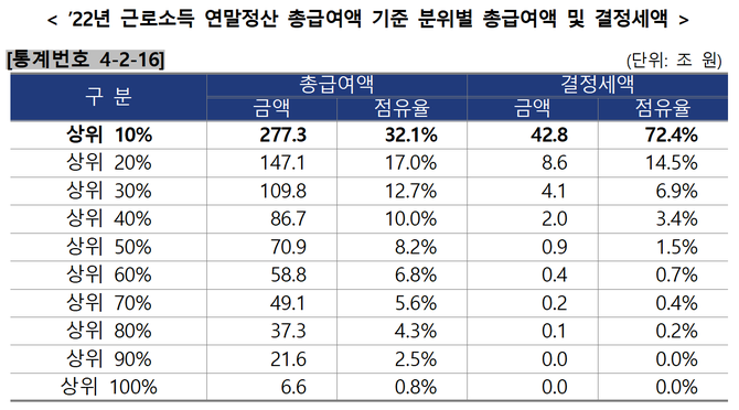 상위 10% 근로자 전체 소득은 277.3조원으로 1인당 평균 소득은 1억3506만원으로 나타났다.
