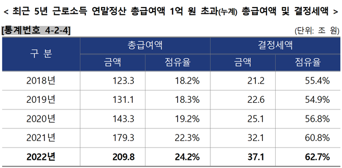 지난해 1억 초과 연봉자들의 수입은 총 209.8조원으로 전체 근로소득의 24.2%를 차지했다.
